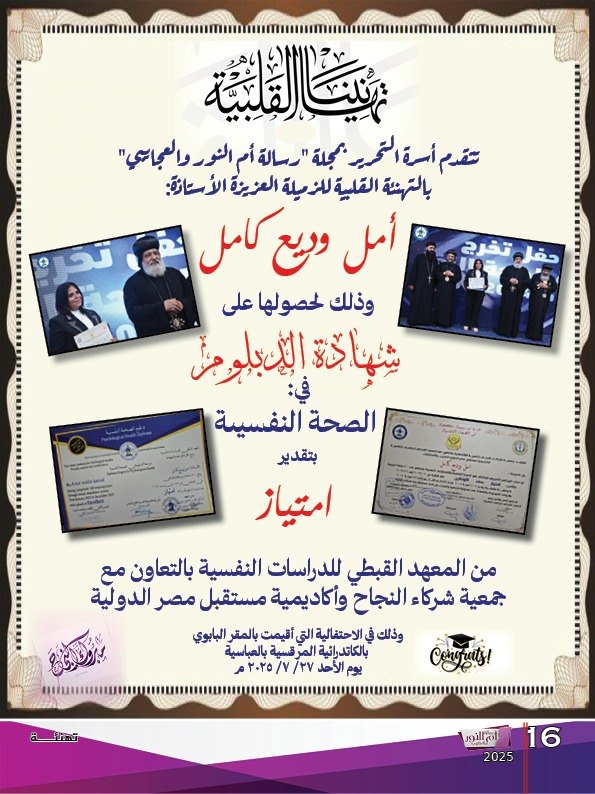 خالص تهانينا القلبية للزميلة والكاتبة بالمجلة الأساتذة أمل وديع مدربة التنمية البشرية محررة باب "بركة حياتنا" لخدمة كبار السن والمسنين.. لحصولها على درجة "الدبلوم" في الصحة النفسية بتقدير "امتياز".. من المعهد القبطي للدراسات النفسية بالتعاون مع جمعية شركاء النجاح وأكاديمية مستقبل مصر الدولية وذلك في الاحتفالية التي أقيمت بالمقر البابوي بالكاتدرائية المرقسية بالعباسية يوم الأحد 27 يوليو 2025 م بحضور لفيف من الآباء الأساقفة والكهنة.. ألف مبروك مع خالص تمنياتنا بمزيد من التفوق والتقدم أسرة التحرير بالمجلة