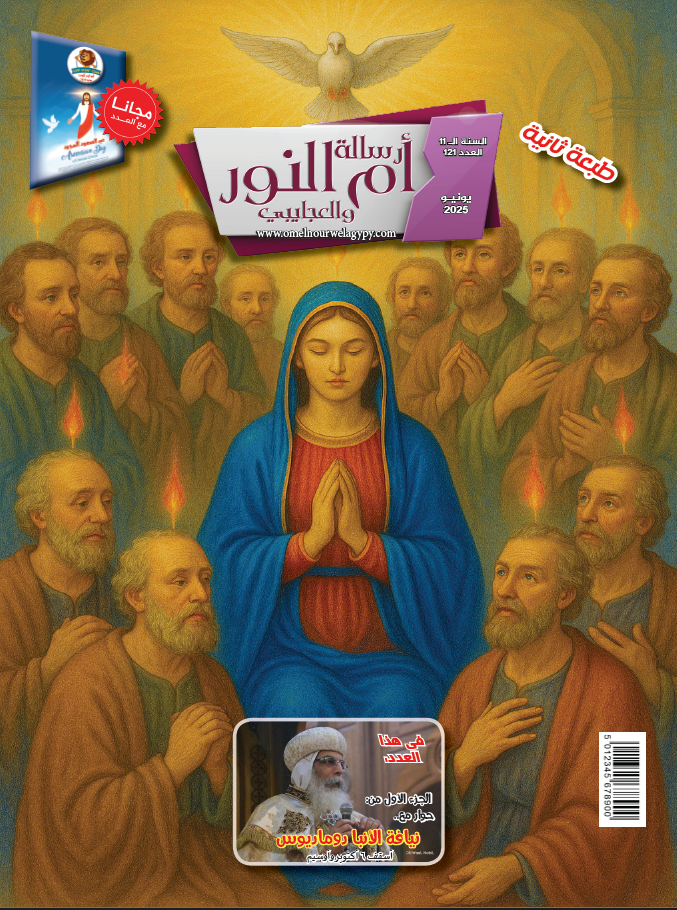 كل شهر وأنتم طيبين وبكل خير صدر بمعونة الرب العدد الشهري الجديد من مجلتكم.. العدد رقم 121.. "رسالة أم النور والعجايبي" عدد شهر يونيو 2025 في شكلها الجديد والمتجدد.. * عدد خاص بمناسبة عيد الصعود المجيد وعيد العنصرة.. * عدد تقرأ فيه الجزء الأول من حوارنا مع أسقفنا المحبوب سيدنا نيافة الأنبا دوماديوس أسقف ٦ أكتوبر وأوسيم.. * مع مقالات طيب الذكر البابا شنودة الثالث، والبابا تواضروس الثاني.. والأنبا دوماديوس أسقفنا.. * وهديتنا لكم بانضمام الدكتور ميلاد فايز موسى إلى أسرة التحرير بالمجلة، وبابًا متجدد بعنوان: "تنمية بشرية مسيحية".. * وفي باب بأقلامهم تقرأ عن: فضيلة العطاء.. وقديسون مجهولون.. بجانب الشعر الروحي لكل محبي الأشعار.. * وفي باب "بركة حياتنا" قدما موضوعًا عن "كيفية تجنب المسنين خطر السقوط".. * وقدمنا موضوعًا في باب "العائلة المقدسة" عن: "الغضب والإحباط في العلاقة الزوجية".. * وفي باب حول العالم قدمنا موضوعًا عن "الكابيتول".. وماهو؟! 🏛 * وفي باب "طريقك إلى طفلك" قدمنا موضوعًا عن "كيفية استغلال الاجازة الصيفية الاستغلال الأمثل".. * ولكي عزيزتي المرأة نقدم أبواب: "صحة وجمال"💇♀🧘♀ و"سفرة وطبلية" لتقديم كل ماهو جديد ومايهم المرأة.. واكلات وصفات لفترة الأعياد🐟 🥩🍔🥓🍗🍖🌭 * كل هذا بجانب أبوابنا الثابتة والمقالات والموضوعات المتجددة التي تهم كل أفراد الأسرة.. ** ولا ننسى أطفالنا الصغار 👦👶 ومجلتهم "ليو كيدز كلوب" مجانا مع العدد وعدد مملوء بالمسابقات والألعاب والتسالي المتنوعة خاصة بعيدي الصعود والعنصرة ⛪☦🎲🎉🎊🎈🏵🎨 عدد تحرص على اقتناءه.. عدد يصلك أينما كنت.. احجز نسختك قبل نفاذها.. وكل عام عام وانتم بخير